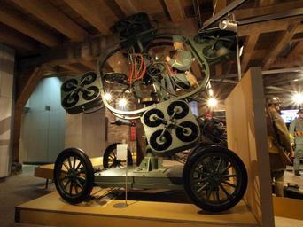 | Keywords: Listening machine pic1.JPG An acoustic aircraft detection device used by the Dutch army in the Legermuseum Delft Before the development of radar acoustic horns like this were employed for air defense to listen for the engine sounds of incoming enemy aircraft It consists of two pairs of horn detectors connected by rubber tubes to stethoscope type earphones worn by a technician represented by mannikin The horizontal pair detected the horizontal position azimuth of the aircraft the vertical pair detected the vertical position elevation own 2010-01-17 12 58 16 AlfvanBeem CC-zero Legermuseum Delft Military related photographs by Alf van Beem Sound locators |