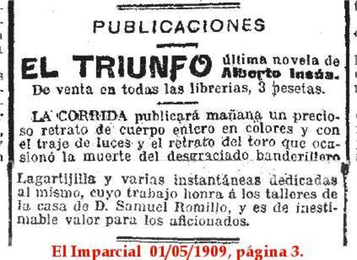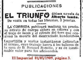 Keywords: Litografia-Samuel-Romillo-1909-Lagartijilla.jpg it Annuncio della prossima pubblicazione su la Corrida del ritratto intero del famoso torero Lagartijilla ossia Rafael Molina Sánchez 1841-1900 e del toro che ne causò la morte El Imparcial Madrid 1 5 1909 pagina 3 Litografia Samuel Romillo 1 5 1909 PD-old 1909 advertisements in Spain Samuel Romillo El Imparcial advertisements 1909 |