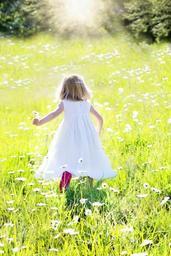 Keywords: little girl running daisies nature grass summer sunny happy meadow childhood joy