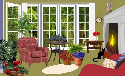 Keywords: living room living fireplace hearth outbreak table armchair black cat flowers window drapes white curtains antique clock reproduction degas glazed doors