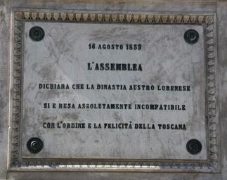 Keywords: Livorno Piazza della Repubblica plaque 01.JPG en ITA Livorno Piazza della Repubblica The plaque is placed at the basement of the monument of Leopold II Grand Duke of Tuscany to remind that on August 16 1859 the Assembly declares that the Austro Lorraine dynasty has become incompatible with the order and the happiness of Tuscany own Piergiuliano Chesi 2013-04-19 Plaques in Livorno Piazza della Repubblica Livorno Plaques referencing 1859 |