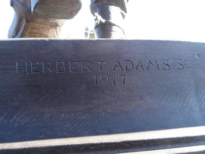 | Keywords: Loammi Baldwin by Herbert Adams, sculptor name - DSC04126.JPG en Loammi Baldwin memorial by Herbert Adams 1858-1945 Woburn Massachusetts USA This statue was created in 1917 and hence is now in the public domain According to the Smithsonian Institution's SIRIS system On bottom rear of sculpture near base HERBERT ADAMS SC/1917 Marked bottom left edge rear of base CAST BY/ROMAN BRONZE WORKS N Y On bronze plaque on front of base in raised letters LOAMMI BALDWIN/PATRIOT/PUBLIC OFFICIAL/BORN JANUARY 21 1745 N S /IN NORTH WOBURN/MASSACHUSETTS/DIED OCTOBER 20 1807 On bronze plaque on east side of base ONE OF THE PROPRIETORS/AND/A PRINCIPAL CONSTRUCTOR/OF THE MIDDLESEX CANAL/A MEMBER OF/THE COMMITTEE TO SIGN/THE PAPER MONEY OF/MASSACHUSETTS BAY COLONY/FIRST SHERIFF OF/MIDDLESEX COUNTY/UNDER THE STATE CONSTITUTION/A LEADER OF AFFAIRS/IN WOBURN On bronze plaque on west side of base A PARTICIPANT WITH THE/RANK OF MAJOR/IN THE BATTLES OF/LEXINGTON AND CONCORD/A COLONEL OF/THE 26TH REGIMENT OF/THE CONTINENTAL ARMY/WITH GENERAL WASHINGTON/DURING THE OCCUPATION/OF NEW YORK/AND IN THE BATTLE/OF TRENTON On bronze plaque on base of base BALDWIN APPLE/DISSEMINATOR OF THE APPLE/IN HONOR OF HIM CALLED/THE BALDWIN/WHICH PROCEEDED FROM A TREE/ORIGINALLY GROWING WILD/ABOUT TWO MILES NORTH/OF THIS MONUMENT signed Founder's mark appears 2012-02-12 own Daderot cc-zero Uploaded with UploadWizard Loammi Baldwin by Herbert Adams |