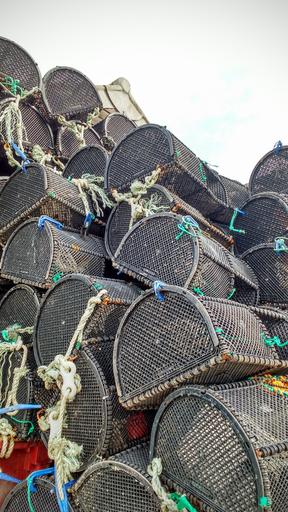 Keywords: lobster crab pot fishing seafood stack heap shellfish basket fisherman