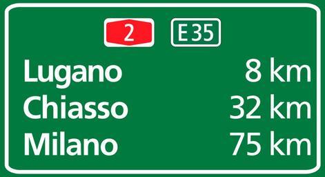 Keywords: Loc.-Lugano.svg en A route confirmation sign on the A2 Highway near Lugano Ticino Switzerland informing motorists of their distance in kilometres from the places listed own Peeperman 03 08 2013 PD-ineligible PD-shape E35 Switzerland