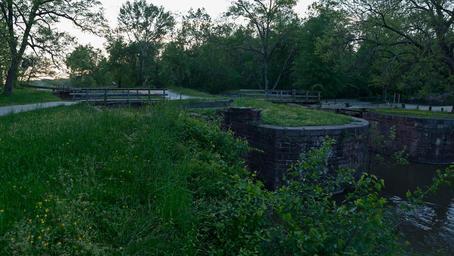 | Keywords: Lock 23 Violettes Lock and Guard Lock no 2 C and O Canal.jpg en Violette's Lock No 23 on right with Guard Lock 2 on left on Chesapeake and Ohio Canal The NPS site http //www hscl cr nps gov/insidenps/report asp STATE PARK CHOH STRUCTURE SORT RECORDNO 183 says Built in 1830 Lock 23 has an 8'6 lift and is 90' -11 long It had a masonry bypass on either side of the upper lock pocket with 3 outlets into the lock below It is constructed of smoothly cut and evenly coursed Seneca red sandstone unlike the Inlet Lock ™s rough cut and coursed stone At some point Lock 23 was raised 40 ™ at the upper end to protect the canal below from high water as was Inlet Lock 2 The lower lock gates were replaced by NPS with modern replicas; there are no upper gates A modern vehicular bridge is located at mid-lock own Bonnachoven Chesapeake Ohio Canal National Historical Park Locks water transport Cc-zero |
