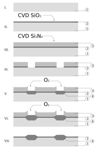 | Keywords: Locos (microtechnology) process.svg The image illustrates the LOCOS technology used in microfabrication mostly to create isolating structures I Preparation of silicon substrate II CVD deposition of SiO2 pad/buffer oxide III CVD deposition of Si3N4 nitride mask IV Etching of nitride layer and silicon oxide layer V Thermal growth of silicon oxide VI Furhter growth of thermal silicon oxide VII Removal of nitride mask 1 Si silicon substrate 2 SiO2 pad/buffer oxide chemical vapor deposition silicon oxide 3 Si3N4 nitride mask 4 SiO2 isolation oxide thermal oxide Own 2008-01-19 Twisp Thermal oxidation SVG microtechnology Chemical vapour deposition |