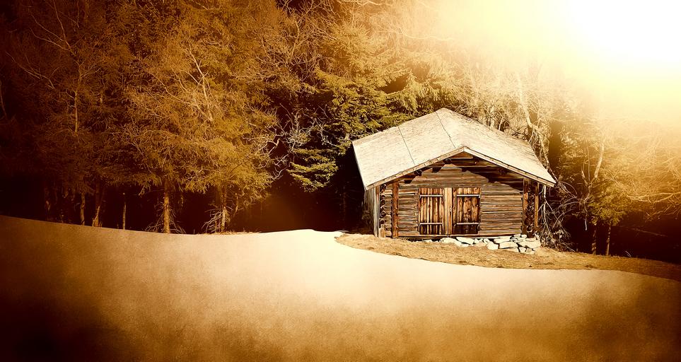 Keywords: log cabin wood mint mountain hut meadow glade heuhütte forest landscape nature light lighting painting digital painting