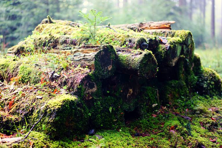 Keywords: log moss green bark fouling weave stacked forestry wood tree trunks break up forest nature like holzstapel morsch strains stack