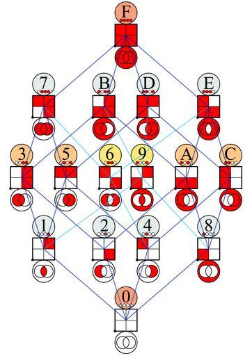 Keywords: Logic-hexadecimal.jpg LargeImage The sixteen nibbles corresponding hexadecimal numbers and 2-circle Venn diagrams ordered in a Hasse diagram Own 2008-03-21 me public domain File Logical connectives Hasse diagram svg Hexadecimal