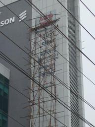 | Keywords: Logica CMG renamed to CGI.JPG en A ladder set to replace Logica's logo on its building after it has been acquired by CGI near Mahadevapura on Ouer Ring Road ORR Bangalore own Veera sj 2013-01-19 Mahadevapura Signboards in Bangalore Scaffolding in India CGI Group Cc-zero |