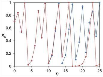 | Keywords: Logistic map example of butterfly effect.png ja パラメータ4のロジスティック写像 ステップ数0から25までの時間発展 鋭敏 (バタフライ効 )の例を図示 赤線: 0 7 線: 0 7+0 00001 en example of sensitive to initial conditions in the two time evolution of logistic map parameter a is 4 red line's initial vale x<sub>0</sub> is 0 7 blue line's is 0 7+0 00001 discrete time n is from 0 to 25 2014-12-31 own Yapparina other versions cc-zero Uploaded with UploadWizard Logistic map | ||||