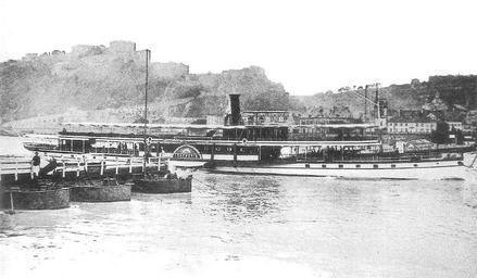 Keywords: Lohengrin (ship, 1890) 002.JPG de Die Lohengrin durchfährt 1895 die Koblenzer Schiffsbrücke scan from Book scan by Rolf H 1895 PD-old Lohengrin ship 1890 Floating bridge in Koblenz