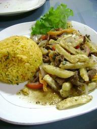 Keywords: Lomo saltado arroz amarillo.JPG es Lomo saltado acompañado de arroz amarillo own Dtarazona Lomo saltado