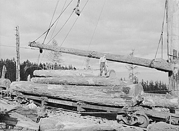 Keywords: Long Bell Lumber Co 01.jpg Long Bell Lumber Company Cowlitz County Washington Fir logs loaded on railroad flatcar for removal from woods http //hdl loc gov/loc pnp/fsa 8c22820 1941-10 Lee Russell PD-USGov Logging railways in the United States Economy of Washington state Flat railway wagons |