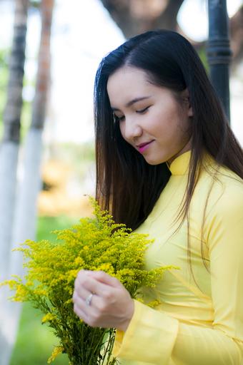 Keywords: long coat yellow girl young fresh vietnam shirt asia portrait yellow shirt fun woman flower sunny friends