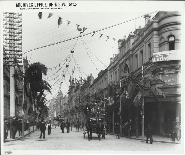 Keywords: archives state records nsw staterecordsnsw newsouthwales blackandwhite sydney royal visit royalvisit duke of cornwall dukeofcornwall flags people women children horse and cart horseandcart decorations pitt street pittstreet outdoor road black and white Corner of Bridge and Pitt Streets - decorated for the visit of the Duke of Cornwall (Exchange Hotel can be seen in the right foreground of photograph) Sydney Dated: May 1901 Digital ID: 4481_a026_000934 Rights: www.records.nsw.gov.au/about-us/rights-and-permissions We'd love to hear from you if you use our photos/documents. Many other photos in our collection are available to view and browse on our website using Photo Investigator. Corner of Bridge and Pitt Streets - decorated for the visit of the Duke of Cornwall (Exchange Hotel can be seen in the right foreground of photograph) Sydney Dated: May 1901 Digital ID: 4481_a026_000934 Rights: www.records.nsw.gov.au/about-us/rights-and-permissions We'd love to hear from you if you use our photos/documents. Many other photos in our collection are available to view and browse on our website using Photo Investigator. |