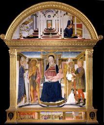 | Keywords: Lorenzo di Pietro known as "Vecchietta" - "Pala di Spedaletto". Madonna with Child and Saints Biagio, John the Baptist, Nicola and Floriano; A... - Google Art Project.jpg  1410 Siena 1410 1480 Siena 1480 Lorenzo male 27795326 di Pietro known as Vecchietta Italian 1410 - 1480 /collection/fondazione-musei-senesi/artwork/pala-di-spedaletto-madonna-with-child-and-saints-biagio-john-the-baptist-nicola-and-floriano-annunciation-lorenzo-di-pietro-known-as-vecchietta/27808357/ Pala di Spedaletto Madonna col Bambino e i Santi Biagio Giovanni Battista Nicola e Floriano Lorenzo di Pietro known as Vecchietta painter sculptor architect goldsmith /artist/lorenzo-di-pietro-known-as-vecchietta/28936204/ 28936204 /collection/fondazione-musei-senesi/ Fondazione Musei Senesi 27793395 http //www museisenesi org/ /collection/fondazione-musei-senesi/artwork/pala-di-spedaletto-madonna-with-child-and-saints-biagio-john-the-baptist-nicola-and-floriano-annunciation-lorenzo-di-pietro-known-as-vecchietta/27808357/ 1462 1462 360 27808357 False 1462 1462 /collection/fondazione-musei-senesi/level/pienza/27947180/ Pienza 28 http //english museisenesi org/media/museo-diocesano Fondazione Musei Senesi Fondazione Musei Senesi Comune di Pienza; Diocesi di Montepulciano Chiusi Pienza; Fondazione Musei Senesi tempera on panel 1460 1470 Pienza Diocesan Museum Province of Siena collocation w270 x h360 cm 1462 False 0 8359375 Fondazione Musei Senesi Object /collection/fondazione-musei-senesi/level/pienza/27947180/diocesan-museum/27939250/ Diocesan Museum pala-di-spedaletto-madonna-with-child-and-saints-biagio-john-the-baptist-nicola-and-floriano-annunciation-lorenzo-di-pietro-known-as-vecchietta Pala di Spedaletto Madonna with Child and Saints Biagio John the Baptist Nicola and Floriano; Annunciation zzz 270 special url_id 1QHEqLy63W1uTA PD-old-100-1923 1480 Google Art Project works by Vecchietta Vecchietta |