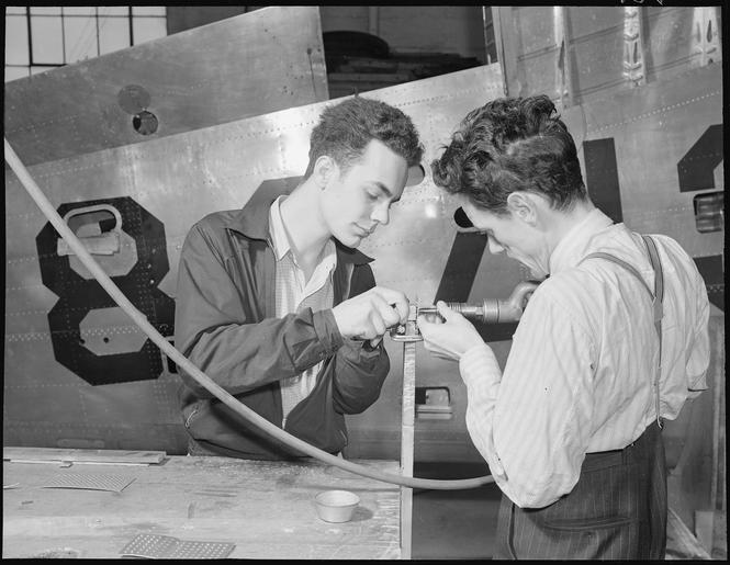 | Keywords: Los Angeles, California. Aircraft Schools. Two boys working on a riveting sampler as a problem on which they will be... - NARA - 532182.tif Scope and content General notes 532182 Local identifier 119-CAL-124 Federal Security Agency National Youth Administration 07/01/1939 - 09/17/1942 NARA-Author Partridge Rondal 1917- Photographer 8464464 <br /> Still Picture Records Section Special Media Archives Services Division NWCS-S National Archives at College Park 8601 Adelphi Road College Park MD 20740-6001 1940-05-01 Record group Record Group 119 Records of the National Youth Administration 1934 - 1945 Record group ARC 448 Study of Youth Photographs compiled 1940 - 1940 Series ARC 532065 File unit File unit ARC Variant control numbers NAIL Control Number NWDNS-119-CAL-124 yes Other versions NARA-cooperation PD-USGov Aircraft riveting Men at work in California Aviation technical schools People of Los Angeles 1940 in Los Angeles Rondal Partridge NARA images of Los Angeles County California |
