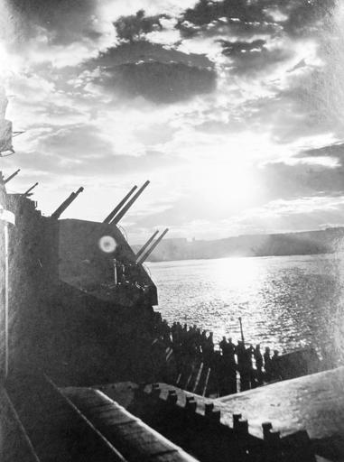 Keywords: blackandwhite monochrome outdoor black and white Lot 10625-17: Navy Day, October 27, 1945. As the sun lowers on the New Jersey shore, the powerful guns are silhouetted against dying light. Crew members line up on deck to watch President Harry S. Truman pass on his way back to shore onboard USS Renshaw (DD 499). Donated by Mr. Thomas J. Watson from a recording America’s tribute to its victorious fleet in first peacetime Navy Day since the start of World War Two. (7/17/2015). Lot 10625-17: Navy Day, October 27, 1945. As the sun lowers on the New Jersey shore, the powerful guns are silhouetted against dying light. Crew members line up on deck to watch President Harry S. Truman pass on his way back to shore onboard USS Renshaw (DD 499). Donated by Mr. Thomas J. Watson from a recording America’s tribute to its victorious fleet in first peacetime Navy Day since the start of World War Two. (7/17/2015). |