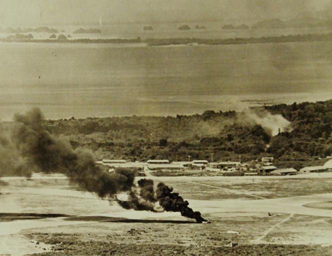 Keywords: outdoor monochrome Lot-5279-4: Task Force 58 Raid on the Palau Islands, 30 March 1944. Black smoke rises from a Japanese plan, hit by American bomb on the airstrip at Palau, during a U.S. Navy carrier task force assault on enemy bases in the Western Caroline Islands of the Central Pacific. TF 58 began bombing of Japanese airfields, shipping, fleet servicing facilities, and other installations at Palau, Yap, Ulithi, and Woleai in the Caroline Islands. TBFs and TBMs from USS Lexington (CV 16), USS Bunker Hill (CV 19), and USS Hornet (CV 12) bombed extensive minefields in and around the channels and approaches to the Palaus in the first tactical use of mines laid by carrier aircraft. U.S. Navy Photograph.(2015/10/30) Lot-5279-4: Task Force 58 Raid on the Palau Islands, 30 March 1944. Black smoke rises from a Japanese plan, hit by American bomb on the airstrip at Palau, during a U.S. Navy carrier task force assault on enemy bases in the Western Caroline Islands of the Central Pacific. TF 58 began bombing of Japanese airfields, shipping, fleet servicing facilities, and other installations at Palau, Yap, Ulithi, and Woleai in the Caroline Islands. TBFs and TBMs from USS Lexington (CV 16), USS Bunker Hill (CV 19), and USS Hornet (CV 12) bombed extensive minefields in and around the channels and approaches to the Palaus in the first tactical use of mines laid by carrier aircraft. U.S. Navy Photograph.(2015/10/30) |