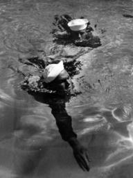 | Keywords: blackandwhite monochrome outdoor black and white Lot-741-1: U.S. Coast Guard, WWII. Coast Guardsmen Learn to Swim For Lives. If you dive over the side to save a life a good thing to know is the “hand tow.” Coast Guardsmen are taught this method of avoiding the death grip of a tired, panicky, possibly injured swimmer in a functional swimming course at Miami, Florida. Coast Guardsmen William H. Roberts and F.C. Smith demonstrate the hand tow. U.S. Coast Guard Photograph. Courtesy of the Library of Congress. Photographed through Mylar sleeve. (2016/06/03). Lot-741-1: U.S. Coast Guard, WWII. Coast Guardsmen Learn to Swim For Lives. If you dive over the side to save a life a good thing to know is the “hand tow.” Coast Guardsmen are taught this method of avoiding the death grip of a tired, panicky, possibly injured swimmer in a functional swimming course at Miami, Florida. Coast Guardsmen William H. Roberts and F.C. Smith demonstrate the hand tow. U.S. Coast Guard Photograph. Courtesy of the Library of Congress. Photographed through Mylar sleeve. (2016/06/03). |