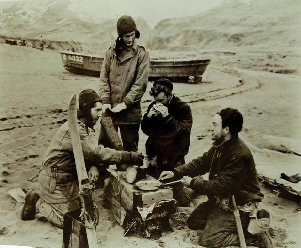 | Keywords: people Lot-803-26: Aleutian Islands Campaign, June 1942 - August 1943. Allied Landing on Attu Island, May 11 1943. The Chow Was Hot, The Company Congenial. There was nothing fancy about this meal prepared by sailors in the Holtz Bay area on May 19, but the food was hot. Note the ski standing upright in the foreground. Snow can be found year round on Attu Island. Note the reused Japanese landing boat in the background. U.S. Navy photograph, released May 29, 1943. Photographed through Mylar sleeve. (2015/11/06). Lot-803-26: Aleutian Islands Campaign, June 1942 - August 1943. Allied Landing on Attu Island, May 11 1943. The Chow Was Hot, The Company Congenial. There was nothing fancy about this meal prepared by sailors in the Holtz Bay area on May 19, but the food was hot. Note the ski standing upright in the foreground. Snow can be found year round on Attu Island. Note the reused Japanese landing boat in the background. U.S. Navy photograph, released May 29, 1943. Photographed through Mylar sleeve. (2015/11/06). |