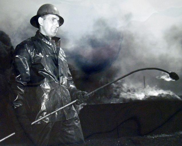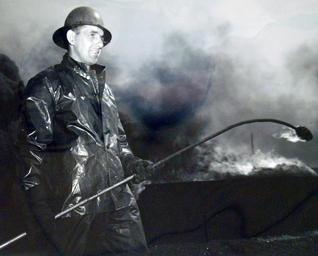 | Keywords: Lot-840-11:  “Firemen of the Fleet,” August 15, 1943.   In peace or war, there is one foe eternally feared by every man that goes to sea – fire.  In wartime, fire is twice as deadly in peace.  Ignited by enemy shells or bombs, the flames menace personnel already busy at their battle stations – and every man called from his post gives the foe that much more advantage during action.  Thus the Navy has founded fire-fighting schools to train specialists in the grim art of extinguishing fires anywhere aboard ship quickly and methodically.  Different methods are taught the seagoing fireman for combatting flames in different sections of the ship.  To lend realism to the courses, substantial “mock-ups” of vessels have been built, in which the trainees learn their grim lessons, mater the use of their flame-fighting equipment.  Shown: Turnabout – For many years an expert in putting out fires, this professional fireman now lights them as part of his duty as instructor in the fire-fighting school. Under his knowing eye, students at the school learn all the “tricks of the trade.”  U.S. Navy Photograph.  Courtesy of the Library of Congress.  (2016/04/14).  Photographed through Mylar sleeve.   Lot-840-11:  “Firemen of the Fleet,” August 15, 1943.   In peace or war, there is one foe eternally feared by every man that goes to sea – fire.  In wartime, fire is twice as deadly in peace.  Ignited by enemy shells or bombs, the flames menace personnel already busy at their battle stations – and every man called from his post gives the foe that much more advantage during action.  Thus the Navy has founded fire-fighting schools to train specialists in the grim art of extinguishing fires anywhere aboard ship quickly and methodically.  Different methods are taught the seagoing fireman for combatting flames in different sections of the ship.  To lend realism to the courses, substantial “mock-ups” of vessels have been built, in which the trainees learn their grim lessons, mater the use of their flame-fighting equipment.  Shown: Turnabout – For many years an expert in putting out fires, this professional fireman now lights them as part of his duty as instructor in the fire-fighting school. Under his knowing eye, students at the school learn all the “tricks of the trade.”  U.S. Navy Photograph.  Courtesy of the Library of Congress.  (2016/04/14).  Photographed through Mylar sleeve.    |