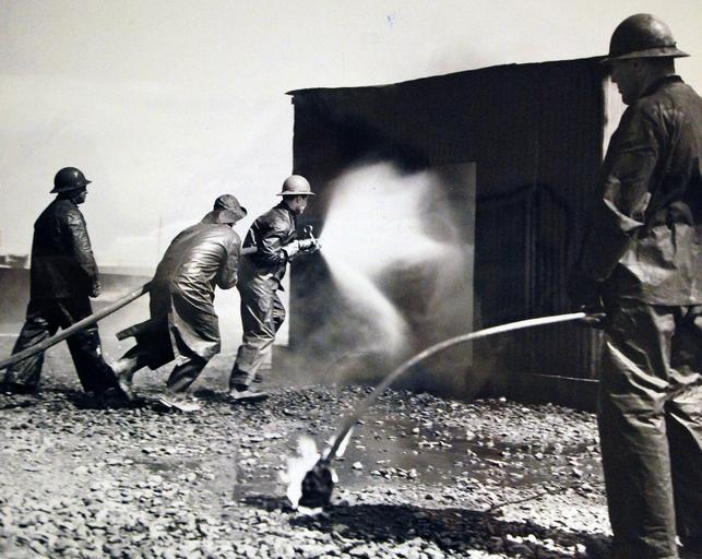 | Keywords: outdoor surreal Lot-840-8:  “Firemen of the Fleet,” August 15, 1943.   In peace or war, there is one foe eternally feared by every man that goes to sea – fire.  In wartime, fire is twice as deadly in peace.  Ignited by enemy shells or bombs, the flames menace personnel already busy at their battle stations – and every man called from his post gives the foe that much more advantage during action.  Thus the Navy has founded fire-fighting schools to train specialists in the grim art of extinguishing fires anywhere aboard ship quickly and methodically.  Different methods are taught the seagoing fireman for combatting flames in different sections of the ship.  To lend realism to the courses, substantial “mock-ups” of vessels have been built, in which the trainees learn their grim lessons, mater the use of their flame-fighting equipment.  Shown: Charge of the Hose Brigade. Spraying a smothering blanket of fog in front of them, student fire-fighters advance on a fire blazing in the Christmas tree shack, constructed to simulate a ship’s compartment.  U.S. Navy Photograph.  Courtesy of the Library of Congress.  (2016/04/14).  Photographed through Mylar sleeve.   Lot-840-8:  “Firemen of the Fleet,” August 15, 1943.   In peace or war, there is one foe eternally feared by every man that goes to sea – fire.  In wartime, fire is twice as deadly in peace.  Ignited by enemy shells or bombs, the flames menace personnel already busy at their battle stations – and every man called from his post gives the foe that much more advantage during action.  Thus the Navy has founded fire-fighting schools to train specialists in the grim art of extinguishing fires anywhere aboard ship quickly and methodically.  Different methods are taught the seagoing fireman for combatting flames in different sections of the ship.  To lend realism to the courses, substantial “mock-ups” of vessels have been built, in which the trainees learn their grim lessons, mater the use of their flame-fighting equipment.  Shown: Charge of the Hose Brigade. Spraying a smothering blanket of fog in front of them, student fire-fighters advance on a fire blazing in the Christmas tree shack, constructed to simulate a ship’s compartment.  U.S. Navy Photograph.  Courtesy of the Library of Congress.  (2016/04/14).  Photographed through Mylar sleeve.    |