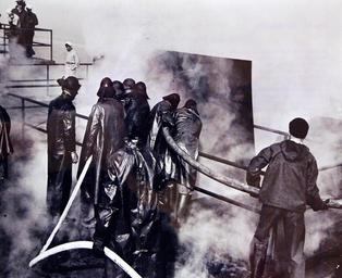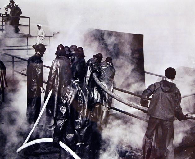 | Keywords: Lot-840-9:  “Firemen of the Fleet,” August 15, 1943.   In peace or war, there is one foe eternally feared by every man that goes to sea – fire.  In wartime, fire is twice as deadly in peace.  Ignited by enemy shells or bombs, the flames menace personnel already busy at their battle stations – and every man called from his post gives the foe that much more advantage during action.  Thus the Navy has founded fire-fighting schools to train specialists in the grim art of extinguishing fires anywhere aboard ship quickly and methodically.  Different methods are taught the seagoing fireman for combatting flames in different sections of the ship.  To lend realism to the courses, substantial “mock-ups” of vessels have been built, in which the trainees learn their grim lessons, mater the use of their flame-fighting equipment.  Shown: Hose Burns Too!   While other students fight a “training” fire below decks, one man is detailed to hold hose off hot deck.  U.S. Navy Photograph.  Courtesy of the Library of Congress.  (2016/04/14).  Photographed through Mylar sleeve.   Lot-840-9:  “Firemen of the Fleet,” August 15, 1943.   In peace or war, there is one foe eternally feared by every man that goes to sea – fire.  In wartime, fire is twice as deadly in peace.  Ignited by enemy shells or bombs, the flames menace personnel already busy at their battle stations – and every man called from his post gives the foe that much more advantage during action.  Thus the Navy has founded fire-fighting schools to train specialists in the grim art of extinguishing fires anywhere aboard ship quickly and methodically.  Different methods are taught the seagoing fireman for combatting flames in different sections of the ship.  To lend realism to the courses, substantial “mock-ups” of vessels have been built, in which the trainees learn their grim lessons, mater the use of their flame-fighting equipment.  Shown: Hose Burns Too!   While other students fight a “training” fire below decks, one man is detailed to hold hose off hot deck.  U.S. Navy Photograph.  Courtesy of the Library of Congress.  (2016/04/14).  Photographed through Mylar sleeve.    |