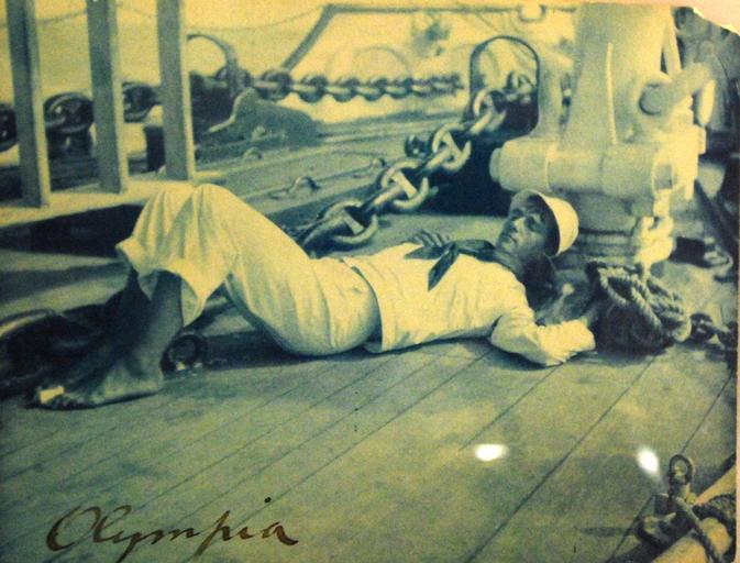 | Keywords: Lot 868823: USS Olympia (Cruiser #6), U.S. Navy sailor resting on deck circa 1899.  Photograph by Francis B. Johnston.  Cyanotype print.  Courtesy of the Library of Congress. (5/15/2015). Lot 868823: USS Olympia (Cruiser #6), U.S. Navy sailor resting on deck circa 1899.  Photograph by Francis B. Johnston.  Cyanotype print.  Courtesy of the Library of Congress. (5/15/2015). |