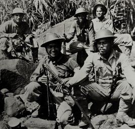 Keywords: people outdoor Lot-9432-17: Battle of Bataan, 7 January – 9 April 1942. These Filipinos Mopped-Up a Japanese Landing Party. This handful of Filipino Scouts had just mopped up a Japanese landing party when the picture was made on the Philippines’ Bataan Peninsula. One of the Scouts holds a Samurai sword, which was taken from Japanese officer who was slain in the fight. Courageous men like these were an important factor in enabling the American and Filipino forces to hold Bataan, in the face of tremendous odds, for more than three months – long after it had been written off by outside military experts. Office of War Information Photograph, 9-15 April 1942. Original photograph is small. (2015/12/18). Lot-9432-17: Battle of Bataan, 7 January – 9 April 1942. These Filipinos Mopped-Up a Japanese Landing Party. This handful of Filipino Scouts had just mopped up a Japanese landing party when the picture was made on the Philippines’ Bataan Peninsula. One of the Scouts holds a Samurai sword, which was taken from Japanese officer who was slain in the fight. Courageous men like these were an important factor in enabling the American and Filipino forces to hold Bataan, in the face of tremendous odds, for more than three months – long after it had been written off by outside military experts. Office of War Information Photograph, 9-15 April 1942. Original photograph is small. (2015/12/18).