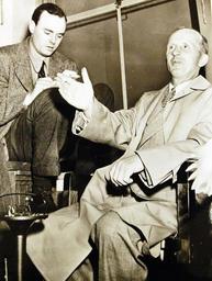| Keywords: people Lot-9436-5: Gallant is the Word for the Norse Skipper. When a small merchant ship offered to pick up Captain Finn Rusti, (right), and 35 fellow survivors of MS Grenanger, he politely turned down the offer because it had lifeboat facilities only for its own crew. Eight days later, however, the gallant captain and his crew were rescued by an American naval vessel with had ample facilities. Captain Rusti is seen in New York City after being rescued. Office of War Information Photograph, March 12-15, 1942. (2016/01/08). Lot-9436-5: Gallant is the Word for the Norse Skipper. When a small merchant ship offered to pick up Captain Finn Rusti, (right), and 35 fellow survivors of MS Grenanger, he politely turned down the offer because it had lifeboat facilities only for its own crew. Eight days later, however, the gallant captain and his crew were rescued by an American naval vessel with had ample facilities. Captain Rusti is seen in New York City after being rescued. Office of War Information Photograph, March 12-15, 1942. (2016/01/08). |
