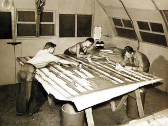 Keywords: Lot 9780-3: The Navy’s Flying Photographers, January 25, 1944. In the long Pacific front, few branches of the Allied forces charged with prying the Japanese out of their scattered island bases are more vital than aerial photo reconnaissance squadrons. Swooping down over the enemy outposts, defying the anti-aircraft fire which guards salient sections, “camera” planes film details of construction and topography invaluable to intelligence officers. From their photographs, scenic maps are made, and photo interpretation reports prepared which supply vital information for combat tactics. Such a squadron is the Navy’s famed, VD-1, based on Guadalcanal. In their own photographs, they tell part of the story of the all important roles they are playing in building the road to Tokyo. Shown: Panorama of Bougainville Shoreline. Members of the photo interpretation section of VD-1 assemble a series of pictures into a panorama of the shoreline around Empress Augusta Bay on Bougainville. When U.S. Marines land on those shores soon after, the pictures and maps therefrom greatly facilitated the invasion. U.S. Navy Photograph. Courtesy of the Library of Congress. (2016/04/22). Lot 9780-3: The Navy’s Flying Photographers, January 25, 1944. In the long Pacific front, few branches of the Allied forces charged with prying the Japanese out of their scattered island bases are more vital than aerial photo reconnaissance squadrons. Swooping down over the enemy outposts, defying the anti-aircraft fire which guards salient sections, “camera” planes film details of construction and topography invaluable to intelligence officers. From their photographs, scenic maps are made, and photo interpretation reports prepared which supply vital information for combat tactics. Such a squadron is the Navy’s famed, VD-1, based on Guadalcanal. In their own photographs, they tell part of the story of the all important roles they are playing in building the road to Tokyo. Shown: Panorama of Bougainville Shoreline. Members of the photo interpretation section of VD-1 assemble a series of pictures into a panorama of the shoreline around Empress Augusta Bay on Bougainville. When U.S. Marines land on those shores soon after, the pictures and maps therefrom greatly facilitated the invasion. U.S. Navy Photograph. Courtesy of the Library of Congress. (2016/04/22). |