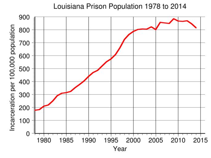 Keywords: Louisiana Prison Population.svg en Louisiana prison incarceration rate per 100 000 population from 1978 to 2014 highest in the country Data from http //www bjs gov/index cfm ty nps BJS 2016-05-10 own Delphi234 other versions current annually Generated with Wikimedia SVG Chart SVG Chart/box cc-zero Prisons in Louisiana Imprisonment and detention rates in the United States |