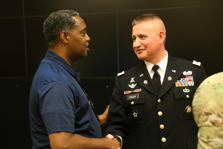 | Keywords: Lt. Gen. Kenneth R. Dahl, commanding general for U.S. Army Installation Management Command, greets Maj. Mark A. Fisher and his family at IMCOM headquarters Sept. 30, 2016, in advance of his promotion ceremony to lieutenant colonel. Family, coworkers and friends gathered at the operations center to hear the call to orders and join together in a receiving line and reception afterward. Dahl read an excerpt from a vintage copy of "The Armed Forces Officer" to inspire Fisher and the audience. (U.S. Army photo by Robert Dozier) |