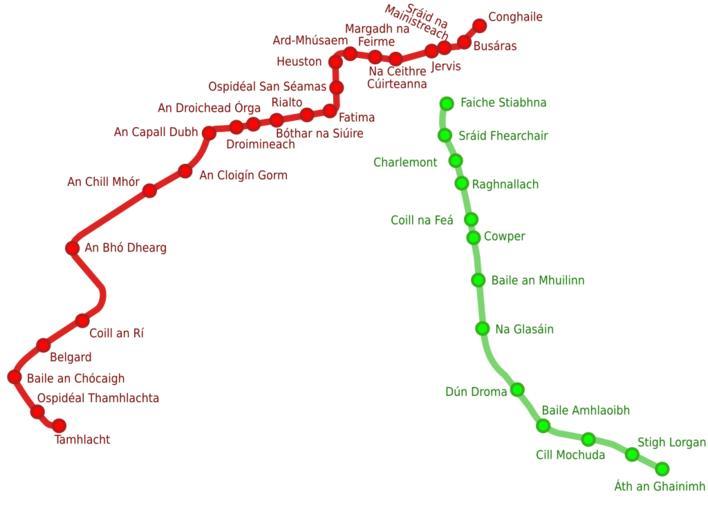 Keywords: Luas network map (ga).svg Network map of Luas Dublin Light Rail System in Irish language Self-made in Inkscape based on en Image Luas network map svg 2008-09-13 User Flrn based on User Mysid's work in English Tram maps of Dublin