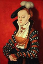 | Keywords: Lucas Cranach - Christiana Eulenau - 1534.jpg artwork Creator Lucas Cranach d Ä Technique beech cm 63 3 44 2 Staatsgalerie in der Neuen Residenz Bamberg http //www lucascranach org/object php page 1 thumb 1 thumb_page 0 obj DE_BStGS_13706_FR349A uid 281 fol 01_Overall img DE_BStGS_13706_FR349A_2010_Overall tif Cranach Digital Archive<br>http //cranach ub uni-heidelberg de/wiki/index php/CorpusCranach Weitere_bekannte_Personen CC-POR-600-013 Corpus Cranach credit line ProvenanceEvent loan Bayerische Staatsgemäldesammlungen exhibition history 14 04 2011 - 17 07 2011 Alte Pinakothek München http //www pinakothek de/kalender/2011-04-14/13997/cranach-bayern Cranach in Bayern Leihgabe der Gemäldegalerie Alte Meister Dresden LangSwitch š1534 ˜ und signiert mit nach links gewandter Schlange mit Ring im Maul und aufrechtem Flügel Artist's insignia winged serpent and dated '1534' ~ Friedländer Rosenberg 1978 Nr FR349A accession number 13706 Own PD-old-100-1923 DEFAULTSORT Cranach Lucas 1; Eulenau Christiane von 1534; Neue Residenz Bamberg Female portraits by Lucas Cranach I Residenzmuseum Bamberg 16th-century oil portraits of women at half length Ž 16th-century portrait paintings in Germany 16th-century three-quarter view portrait paintings of women facing left Ž 16th-century women looking at viewer in art Ž 1530s paintings in Germany 1530s portrait paintings 1534 paintings Collars in art Black and red clothing in art female Black berets in art Feathered headdresses in art female Ostrich plumes in art Portrait paintings of females with green background Ž Portrait paintings with red background Ž Puff sleeves Renaissance paintings of women with hair with pearl jewellery Women facing left and looking at viewer in art Ž |