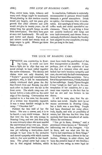 Keywords: Luck of Roaring Camp.jpg en First page of the short story The Luck of Roaring Camp by American writer F Bret Harte From the Overland Monthly August 1868 Scanned by http //quod lib umich edu/m/moajrnl/ahj1472 1-01 002/1 16 view toc;q1 luck+of+roaring+camp Making of America project 1868-08 From http //quod lib umich edu/m/moajrnl/ahj1472 1-01 002/1 16 view toc;q1 luck+of+roaring+camp Making of America University of Michigan Bret Harte author other versions PD-old-70-1923 Overland Monthly Bret Harte 1868 in California Uploaded with UploadWizard |