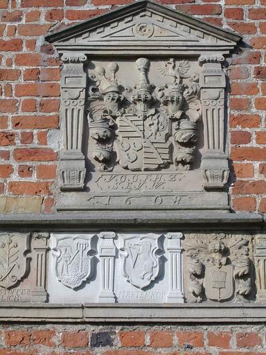 Keywords: Lüdingworth, Bauernwappen 1.JPG Wappen Herzog Franz II von Sachsen Engern und Westfalen Lauenburg 1547 “1619 Herzog seit 1581 zu dem Hadeln gehörte darunter Hadler Bauernwappen am Chor der St Jacobi-Kirche in Cuxhaven-Lüdingworth Abgekürzte Inschrift V on G ottes G naden F ranz H erzog Z u S achsen E ngern U nd W estfalen Coat-of-arms of Duke Francis II of Duchy of Saxony Angria and Westphalia Lauenburg 1547 “1619 Duke since 1581 to which the Land of Hadeln used to belong below coats-of-arms of Hadelian peasant families at the quire of St James Church in Lüdingworth Cuxhaven The coat of arms as used between 1507 and 1671 shows in the upper left quarter the Ascanian barry of ten in or and sable covered by a crancelin of rhombs they are not shown in this undetailed copy bendwise in vert <ref>The House of Wettin also adopted the barry of ten with the crancelin as its coat-of-arms when it gained Saxe-Wittenberg which is why the barry reappears in the arms of many formerly Wettin-ruled states </ref> The crancelin symbolises the Saxon ducal crown The second quarter shows in azure an eagle crowned in or representing the imperial Pfalzgraviate of Saxony The third quarter displays in argent three water-lily leaves in gules standing for the County of Brehna The lower right fourth quarter repeats the first quarter The Lauenburg branch duchy adopted this coat-of-arms from Saxe-Wittenberg displaying the coats-of-arms of parts of that duchy However the quarters then used for the Duchy of Saxony Angria and Westphalia Lauenburg were later often misinterpreted as symbolising Angria Brehna's water-lily leaves and Westphalia the comital palatine Saxon eagle Foto von Benutzer Geoz 2005 2005-11-11 own assumed Geoz Notes <references/> Reliefs in Landkreis Cuxhaven St -Jacobi Lüdingworth Francis II Duke of Saxe-Lauenburg Saxe-Lauenburg coat of arms 1608 works in Germany Reliefs of coats of arms in Lower Saxony Ludingworth |