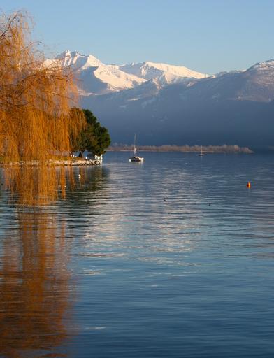 Keywords: lugano switzerland water lake mountains winter snow sol mirrors quiet boat sail blue sky