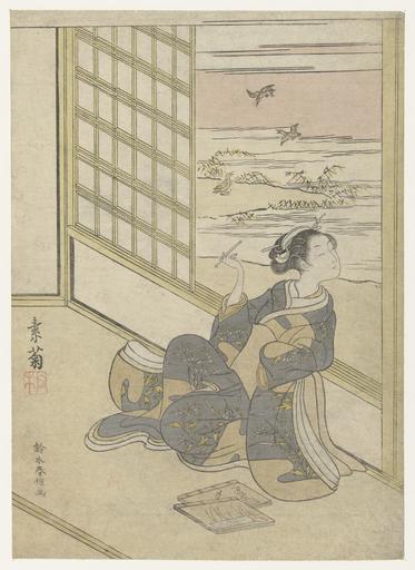 Keywords: Luisterend naar de watersnip-Rijksmuseum RP-P-1964-800.jpeg accession number RP-P-1964-800 Suzuki Harunobu; Suzuki Harunobu died 1770; Sogiku credit line nl Meisje met haarpen in haar rechter hand zit tegen een vensterbank en kijkt naar buiten naar een landschap met water en vogels; naast haar op de vloer twee boeken Waarschijnlijk deel van een twee- of drieluik Label Line mentioned on object Suzuki Harunobu 1725 - 1770 1765 kleurenhoutsnede; lijnblok in zwart met kleurblokken; blinddruk Collection prenten; Japan collectie blad Height mm 272 blad Width mm 194 exhibition history Institution Rijksmuseum paper object history Acquisition 1964 object type prent PD-US PD-old-100 Data and photography rights All data and all images made available through the API are either in the public domain or are subject to a CC0 license https //www rijksmuseum nl/en/api/terms-and-conditions-of-use cc-zero place of creation Japan Jap Cat I 31; Forrer 1 http //www rijksmuseum nl/collectie/RP-P-1964-800 http //hdl handle net/10934/RM0001 COLLECT 45340 handle Luisterend naar de watersnip Uploaded with GWToolset Rijksmuseum RP-P-1964-800 http //www rijksmuseum nl/media/assets/RP-P-1964-800 Images uploaded by Fæ Images from the Rijksmuseum Japanese 18th-century prints in the Rijksmuseum Amsterdam |