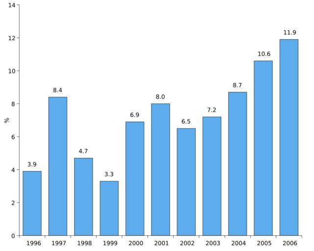 Keywords: Lv real gdp growth.svg Annual change in the real GDP of Latvia from 1996 to 2006 Eurostat database GDP - Constant prices percentage change on previous period graph own work 2007-06-18 Jkv PD-Own R source R version 2 3 www r-project org Eurostat GDP constant prices percentage change on previous period Latvia 1996 - 2006 x <- c 3 9 8 4 4 7 3 3 6 9 8 0 6 5 7 2 8 7 10 6 11 9 names x <- 1996 2006 library RSvgDevice devSVG lv_real_gdp_growth svg width 15 height 12 par mar c 3 2 4 1 1 las 1 mgp c 2 2 1 0 cex 2 y <- barplot x ylim c 0 14 ylab space 4 col steelblue2 xlim c 2 16 xaxs i text y x+ 3 format x digits 2 axis 1 c 2 y+ 7 labels F dev off Economy of Latvia GDP bar charts Created with R