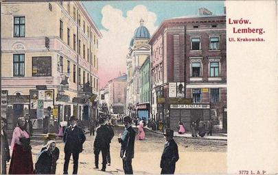 | Keywords: Lwow,ul.Krakowska .Jewish.jpg  ru Вид на ул К аковскую в авст ийском Львове с вывесками ев ейских магазинов с еди них - вывески на языке идиш 1905 private collection author other versions PD-Art Krakivska Street Lviv Judaism in Lviv Postcards of Austria-Hungary Postcards of Lviv |