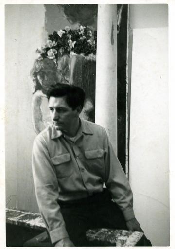 Keywords: Lyn Ott.jpg Lynfield Ott in his Woodstock New York art studio in 1964 the year he and his wife Phyllis heard of Meher Baba from Tom and Yvonne Riley The painted figure in the background is of Phyllis Ott painted by Lyn in 1963 or 1964 It was part of a 1965 exhibition at Lovisco Gallery in New York City The flowers in the painting are actual plastic flowers inserted into the painting All the paintings in the show were vertical and stood 9' high They included The Red Highheels with actual red highheels on a platform at floor level and The Secret with a locked box at the lower platform containing a hidden gold necklace All paintings in the show were sold Lyn Ott sent an invitation to the show to Meher Baba in India In reply Ott received a cable from Meher Baba which read 'I will be at your show viewing my reflection in your work ' PD-heirs Lyn Ott