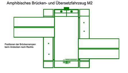 Keywords: M2 Andocken.png en Amphibious bridge vehicle M2 vehicle with ramps in position for docking to the left side of another de Amphibisches Brücken- und à bersetztfahrzeug M2 Positionen der Brückenrampen beim Fähren- oder Brückenbau mit Andocken nach rechts own Steinbeisser 2 2 11 Cc-zero Schwimmschnellbrücke M2B |