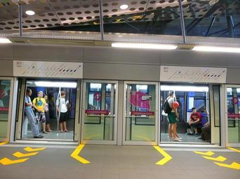 Keywords: M2-Lausanne-Gare1.jpg en The M2 Lausanne Gare station showing one of the steeply graded platforms Own Spsmiler Lausanne metro m2 MP 89 TL Full-height platform screen doors Lausanne railway station