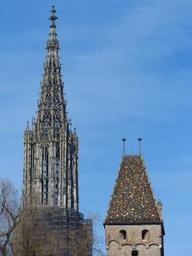 Keywords: münster ulm cathedral tower steeple spire artwork stonemason old monument places of interest metzgerturm hipped roof building brick colorful color light city view