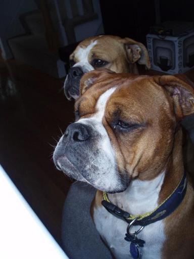 Keywords: Macky.jpg en Brother and sister breed of the Olde English Bulldogge breed The male has a more broad short build front as the female has more slender longer build Both are around two years old in picture own Shaunmeunier date Olde English Bulldogge |