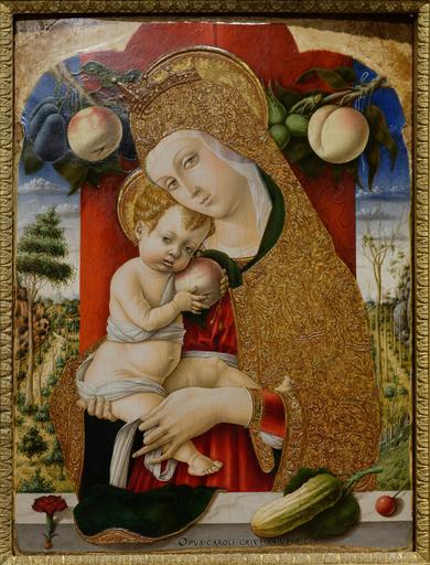 | Keywords: Madonna col Bambino Carlo Crivelli GAC.jpg Art Photo Creator Carlo Crivelli Madonna and Child holding an apple; on the sill a cucumber symbol of the Resurrection a carnation and a cherry symbols of the Christ's Passion ca 1480 1483 tempera panel Institution Accademia Carrara Bergamo object history Guglielmo Lochis credit line ProvenanceEvent bequest Guglielmo Lochis 1866 accession number own photo date 2015-09-10 Marie-Lan Nguyen artwork license PD-old-100-1923 photo license other versions Madonna and Child with an apple by Carlo Crivelli Galleria dell'Accademia Carrara Bergamo Taken with Nikon D800E Taken with AF-S Zoom-Nikkor 24-70mm f/2 8G ED |