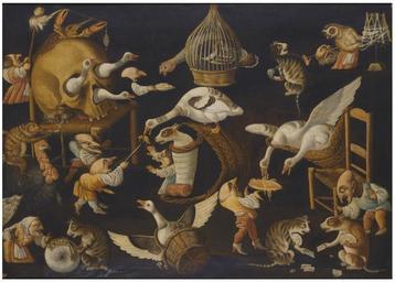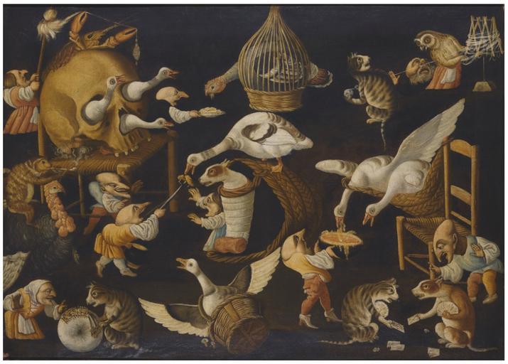 Keywords: Maestro della Fertilità dell'Uovo - A grotesque scene with animals playing and a dog wrapped in swaddling clothes.jpg Artwork creator Maestro della Fertilità dell'Uovo en A grotesque scene with animals playing and a dog wrapped in swaddling clothes 17th century http //www sothebys com/en/auctions/ecatalogue/2012/from-the-collection-of-prince-and-princess-henry-de-la-tour-dauvergne-lauraguais/lot 3 html oil canvas cm 85 120 Sold at Sotheby's on 3 May 2012 in London lot 3 Other versions PD-old-100 Maestro della Fertilità dell'Uovo Animals acting as humans in art Animals with human clothing World upside down |